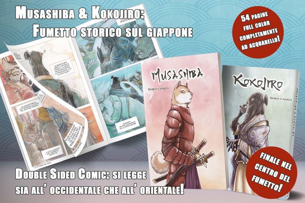 Musashiba & Kokojiro, crowdfundato sulla piattaforma “Eppela” nel 2020, nasce a seguito di due illustrazioni, una di Musashi come Shiba Inu, ed una di Kojiro versione Pappagallo nero. Così, da queste due immagini, abbiamo iniziato a leggere e a raccogliere informazioni sulle figure storiche e mitologiche di Musashi Miyamoto e Kojiro Sasaki. In molti racconti i due vengono raffigurati come antitesi per eccellenza, eppure in realtà abbiamo solo una testimonianza della loro rivalità: il duello sull’isola di Funajima (oggi Ganryujima) nel 1612. Nella gran parte delle cronache l’uno era visto come il samurai per eccellenza della sua epoca, l’altro come un gretto ronin dedito ai sotterfugi per ottenere la vittoria.